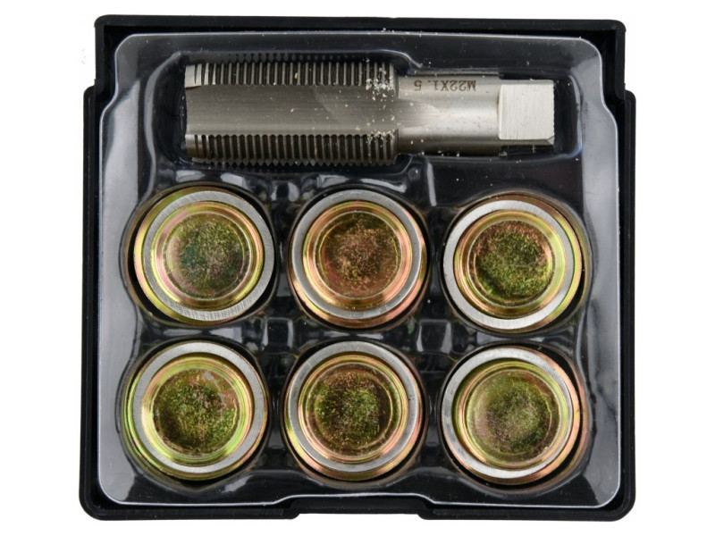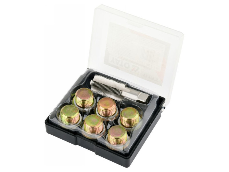 Készlet az olajteknő leeresztőcsavarjának meneteinek egyszerű javításához, sebességváltókhoz stb. Illeszkedik a személygépkocsiknál és kisteherautóknál általánosan használt legtöbb menethez.