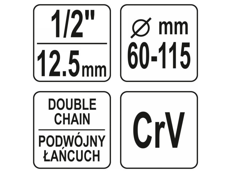 Kettős láncvilláskulcs 60-115 mm átmérőjű acél olajszűrőkhöz. Mechanikai műhelyek és autóipari szervizek számára ajánlott.