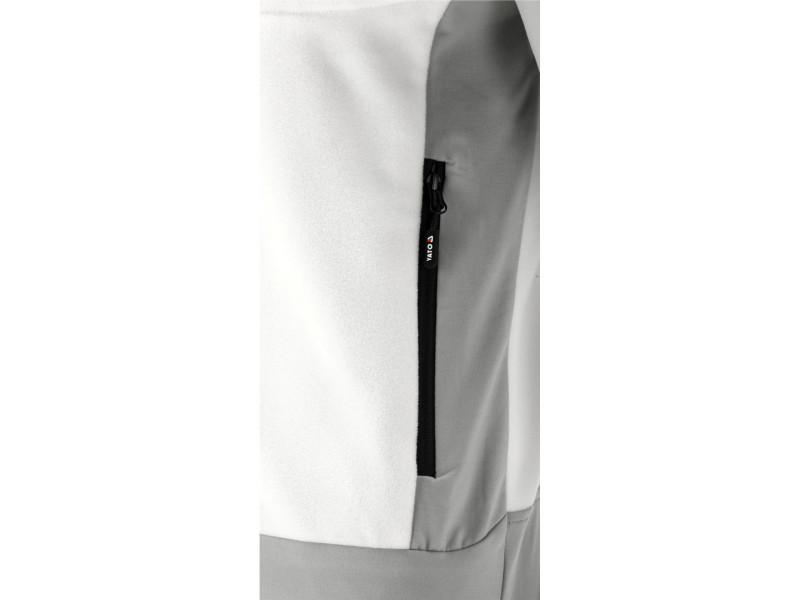 - A 2-way stretch anyag oldalt, hónalj alatt és részben az ujjak alján szinte teljesen megszünteti a hagyományos polárok munkavégzés közbeni kellemetlenségeit, pl. törzsforgás vagy a fej felett végzett munka során. Jobb levegőcirkulációt biztosít, kevésbé izzadunk, különösen a hónalj területén.