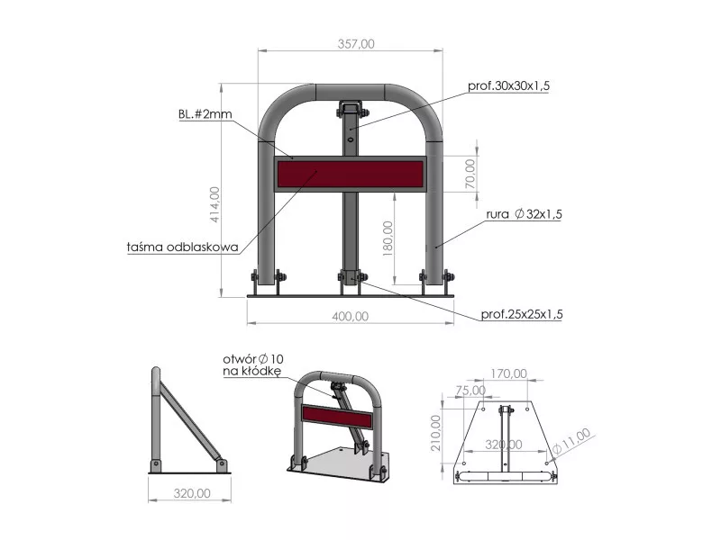 Összecsukható "patkó" parkolózár, amely hatékonyan védi a területeket az illetéktelen behajtás vagy a járművek parkolása ellen. Kényelmet és biztonságot nyújt a kijelölt területekhez való hozzáférés kezelésében. Lehetővé teszi a parkolóhelyek vagy bejáratok ideiglenes lezárását, pl. magántulajdonban lévő ingatlanokon, gyalogutakon, zöldterületeken, árvízvédelmi töltéseken, sétányokon.