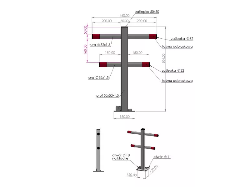 Összecsukható parkolózár "karácsonyfa", amely hatékonyan biztosítja a területeket az illetéktelen behajtás vagy a járművek parkolása ellen. Kényelmet és biztonságot nyújt a kijelölt területekhez való hozzáférés kezelésében. Lehetővé teszi a parkolóhelyek vagy a behajtás ideiglenes lezárását, pl. magánterületeken, gyalogutakon, zöldterületeken, árvízvédelmi töltéseken, sétányokon.
