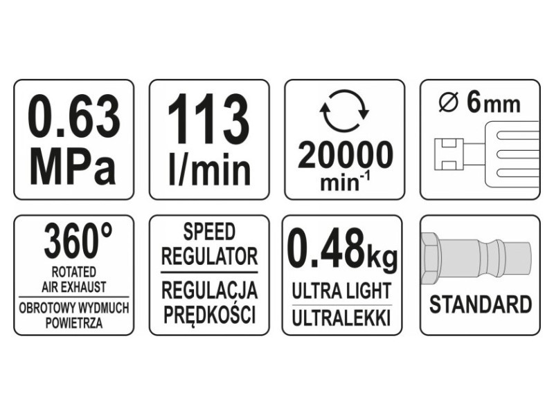 | Állítsa be a tartalmat | pneumatikus köszörű, tömlőcsatlakozó, szerszámtartó kulcs x2 |