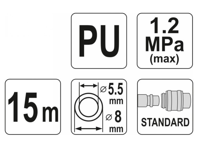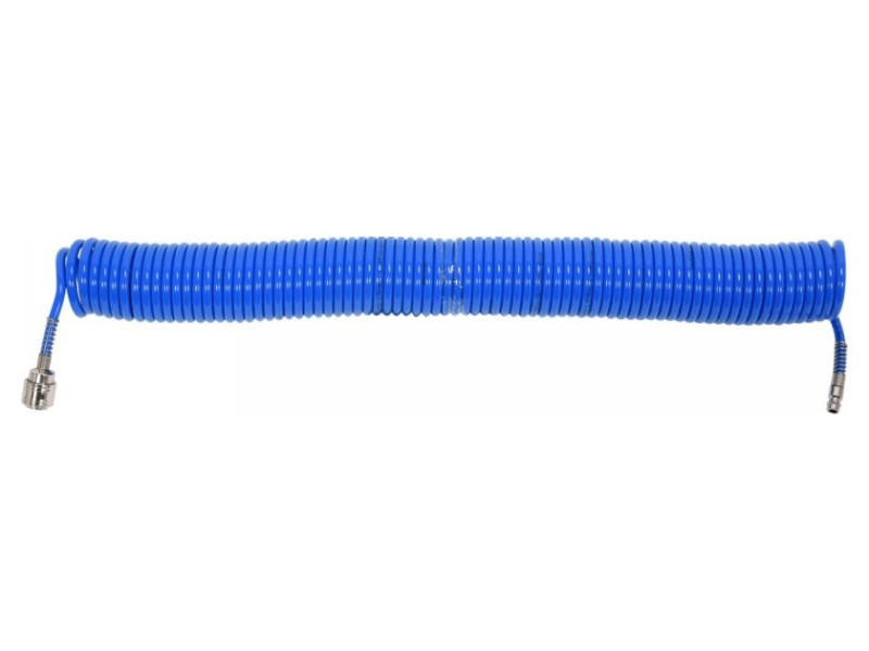 Professzionális spirális pneumatikus tömlő gyorscsatlakozókkal. Az 5,5x8 mm-es, 15 méter hosszúságú tömlő ellenálló poliuretánból készült. A tömlő ellenáll az alacsony és magas hőmérsékletnek, így a műhelyen kívül is használható.
