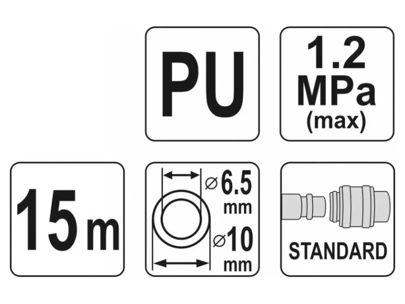 Professzionális spirális pneumatikus tömlő gyorscsatlakozókkal. A tömlő mérete 6,5x10 mm, hossza 15 méter, és ellenálló poliuretánból készült. A tömlő ellenáll az alacsony és magas hőmérsékletnek, így a műhelyen kívül is használható. A finom tekercses kialakítás helytakarékos, a gyárilag beépített gyorscsatlakozók pedig minden műhelyben vagy gyártóüzemben nélkülözhetetlen eszközzé teszik.
