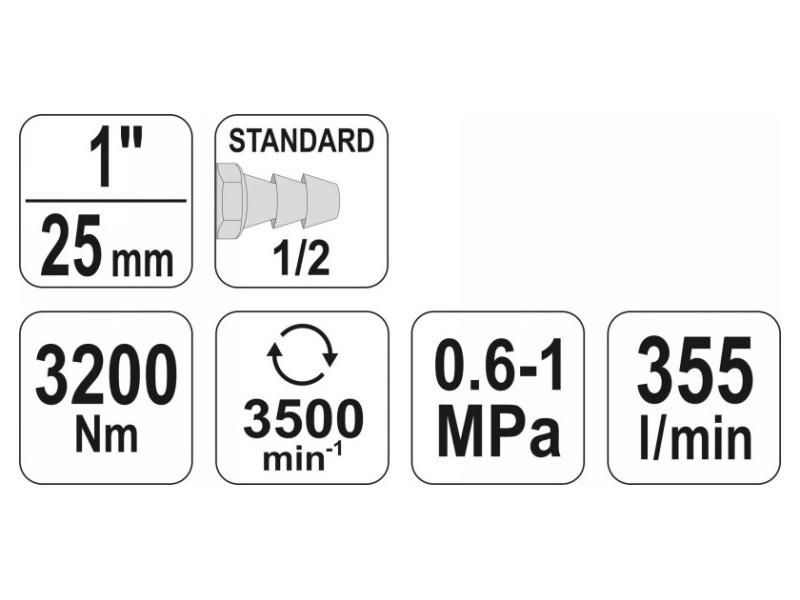 A csavarkulcs 355 l/perc légáramot és 0,6-1 MPa nyomást igényel.