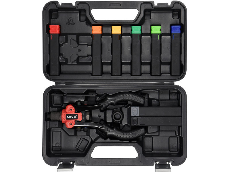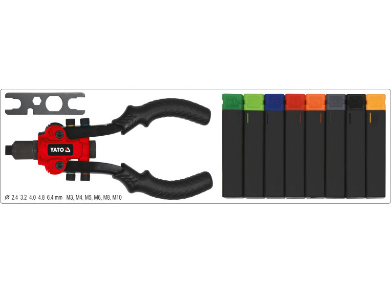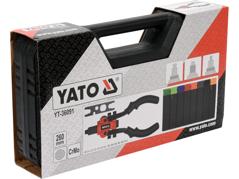 A YATO YT-36091 3-funkciós szegecselőgépet szegecselt anyákkal, szegecsekkel és két vágóval (szögletes és kerek) történő anyagösszekötések készítésére tervezték.