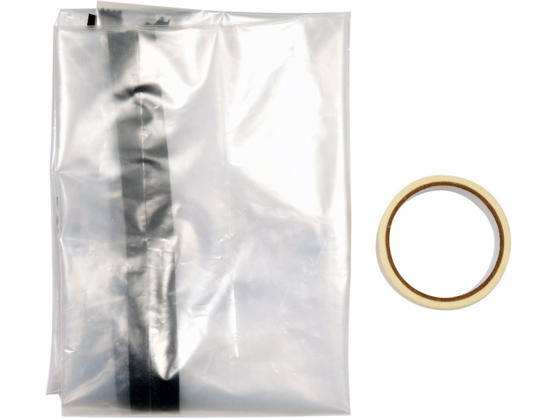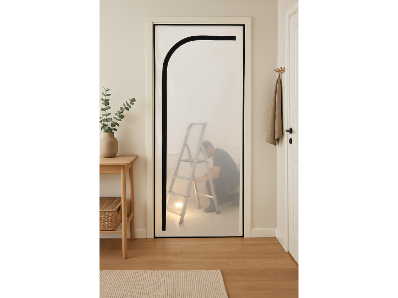 Vastag, színtelen, átlátszó PE-fóliából készült porvédő ajtónyílásokhoz. A nyílásrész fordított L alakú, és bevarrt cipzárral nyitható. A fólia ragasztószalaggal van rögzítve. A fólia szélein erős, vastag szalagból készült 2 pontos rögzítés található.