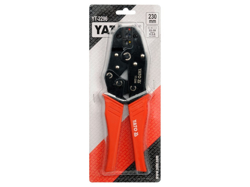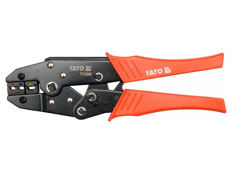 YT-2296 fogó szigetelt csatlakozók krimpeléséhez, a korrózió megelőzése érdekében feketére festett felülettel és műanyag fogantyú sapkával. A racsnis mechanizmus lehetővé teszi a gyors és pontos krimpelést túlzott erő nélkül.