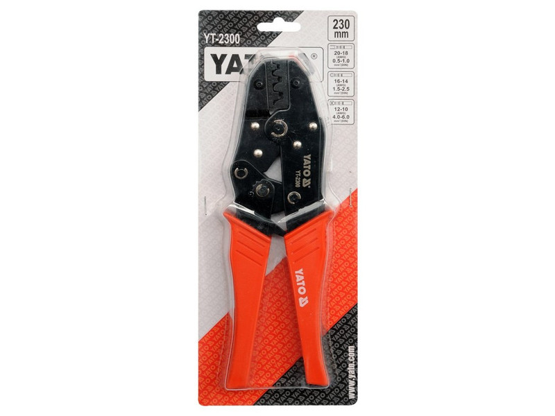 YT-2300 fogó nem szigetelt csatlakozók krimpeléséhez, a korrózió megelőzése érdekében feketére festett felülettel és műanyag fogantyú sapkával. A kétfokozatú pofák formája megkönnyíti a nem szigetelt csatlakozó előretolását a krimpelőbe, míg a racsnis mechanizmus pontosan és szilárdan krimpeli azt.