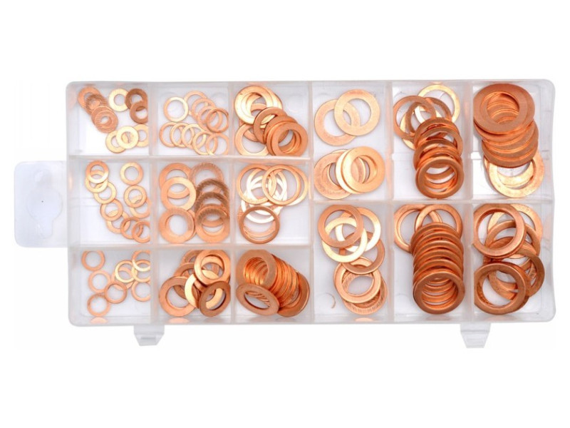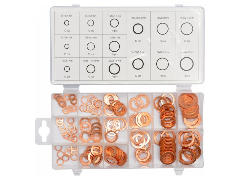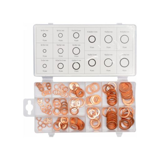 Réz alátétkészlet műhelyalkalmazásokhoz. Csomag tartalma: A csomagban található: 10 db:5x10x1; 10 db:8x11x1; 10 db:11x17x1,5; 10 db:12,5x20x1,5; 10 db:15x20x2; 10 db:16,5x24x2; 10 db:6x10x1; 10 db: 10 db:10x16x1; 10 db:14x18x1; 10 db:7x10x1; 10 db:10,5x17x1,5; 10 db:12x20x1,5; 10 db:14x20x1,5; 10 db:16x22x2; 10 db:17,5x24x2. Mindegyik praktikus műanyag dobozba csomagolva, rekeszekkel a rend és a betétméretek helyes elkülönítése érdekében.