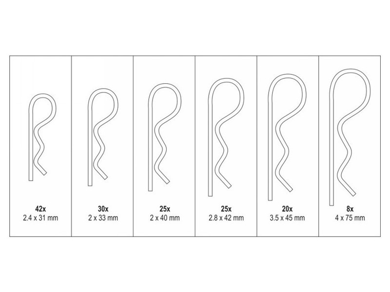 | Állítsa be a tartalmat | rugós csapok x150 (2x33 mm x30, 2x40 mm x25, 2,4x31 mm x42, 2,8x42 mm x25, 3,5x45 mm x20, 4x75 mm x8) |