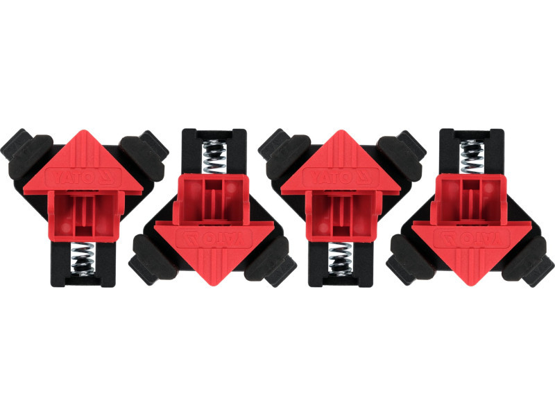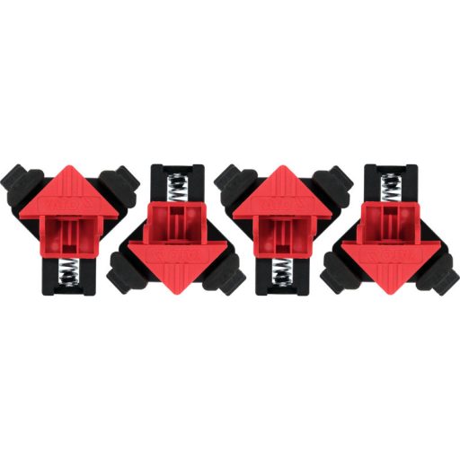 Négy darab erős, rugós szögcsipeszből álló készlet, amelyet 90 fokos munkadarabok rögzítésére terveztek. A szorítótestek PA6 műanyagból készülnek, és erős acél nyomórugókkal vannak ellátva. Munkatartomány 5 és 22 mm között. Külső méretek 80 x 85 x 50 mm. A szorítók makettezéshez és asztalosmunkákhoz készültek, különösen hasznosak képkeretek stb. készítéséhez.