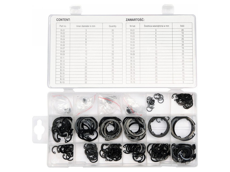 Professzionális 300 darabos belső Seger gyűrűkből álló készlet. A készlet 18 különböző méret keverékét tartalmazza. Mindez egy robusztus szervezőben. Nélkülözhetetlen az autóipari műhelyben, a mezőgazdaságban vagy az iparban.