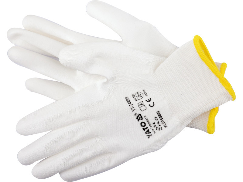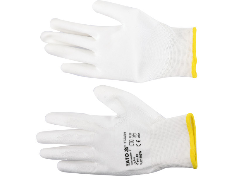 Védő munkakesztyűk fehér nylonból készültek, fehér poliuretánnal bevont fogó részen. A megszokottnál vastagabb poliuretán bevonat és a magas minőségű poliuretán biztosítja a legmagasabb EN 388 szabvány szerinti kopásállóságot. A varratmentes, magas minőségű nylon konstrukció növeli a szakításállóságot és megőrzi az elasticitást hosszabb ideig. A finom 15G varrás, azaz 15 öltés hüvelykenként, alacsonyabb súlyt és még jobb tapadást biztosít a kézhez.