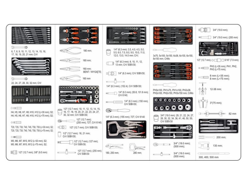 BESZERZÉS 1: Kombikulcsok YT-0335~YT-0350 (6, 7, 8, 9, 10, 11, 12, 13, 14, 15, 16, 17, 18, 19, 20, 21 mm) BESZERZÉS 2: Kombikulcsok YT-0351~YT-0360 (22, 24, 27, 28, 30, 32 mm) BESZERZÉS 3: 1/2" és 3/8" ADAPTOROK & 3/8"; HEX bitek, 30 MM (H4, 5, 6, 6, 7, 8, 10, 12) & 75 MM (H4, 5, 6, 7, 8, 10, 12) / TORX bitek, 30 MM (T20, T25, T30, T40, T45, T50, T55) & 75 MM (T20, T25, T30, T40, T45, T50, T55) / SPLINE bitek, 30 MM (M5, 6, 8, 10, 12) &75 MM (M5, 6, 8, 10, 12) BESZERELÉS 4: (10, 11, 12, 13, 14, 15, 16, 17, 18, 19, 20, 21, 22, 23, 24, 27, 30, 32 MM), racsni YT-0732 1/2", CRV 6140, 72T / YT-1247 hosszabbító 1/2" 127 MM / YT-1252 kardáncsukló 1/2", YT-1253~YT-1254 gyertyatartó 1/2", 16 MM, 21 MM, YT-1243 T-markolat 1/2" 255 MM-ES BETÉT 5: 1/4" hatlapos dugókulcsok YT-1401~YT-1412 (3,5; 4; 4,5; 5; 5,5; 6; 7; 8; 9; 10; 11; 12; 13; 14 mm), YT-1419~YT-1424 (8, 10, 11, 12, 13 MM), 1/4" hosszabbító, YT-1429 (50,8 MM) & YT-1431 (101,6 MM), YT-1437 1/4" kardáncsukló, YT-1425 1/4" T-gomb, 152,4 MM, YT-0730 1/4" racsni, 72TH, CRV6140 BETÉT 6: YT-1941 univerzális fogó, CR-V, 180 MM / YT-1943 hosszúkás egyenes fogó, CR-V, 160 MM, YT-1945 hosszúkás hajlított fogó, CRV, 160 MM/ YT-1947 oldalvágó fogó, CRV, 160 MM 7. BESZERZÉS: Laposfejű csavarhúzók YT-2760 3x75 MM; YT-2763 5x100 MM, YT-2764 5x150 MM, YT-2765 6x38 MM, YT-2766 6x100 MM, YT-2767 6x150 MM, YT-2769 8x150 MM 8. BESZERZÉS: Phillips csavarhúzók YT-2771 PH0x100 MM; YT-2772 PH1x75 MM, YT-2773 PH1x100 MM, YT-2775 PH2x38 MM, YT-2776 PH2x100 MM, YT-2777 PH2x150 MM, YT-2779 PH3X150 MM BESZERZÉS 9: YT-2452, YT-2453, YT-2468 krimpelő fogó BESZERZÉS 10: (YT-1301); 21 MM (YT-1302); 22 MM (YT-1303); 24 MM (YT-1305); 27 MM (YT-1308); 28 MM (YT-1309); 30 MM (YT-1311); 32 MM (YT-1312); 34 MM (YT-1314); 36 MM (YT-1316); 41 MM (YT-1318); 46 MM (YT-1322); 50 MM (YT-1324); 55 MM (YT-1328) 11. PATRON: (YT-1360); hosszabbító 3/4 "x200 MM (YT-1341); kardáncsukló 3/4" (YT-1352); T-gomb 3/4 "x500 MM (YT-1350) BESZERZŐ 12: csapágyhúzó (YT-2510); ütvecsavarhúzó (YT-2802); rugóhúzó (YT-2544); kétkarú húzó (YT-2515) BESZERZŐ 13: (YT-0615); golyóscsapszeg-húzó (YT-0612); gumilapát 500 MM (YT-0809); 400 MM (YT-0808);300 MM (YT-0807)
