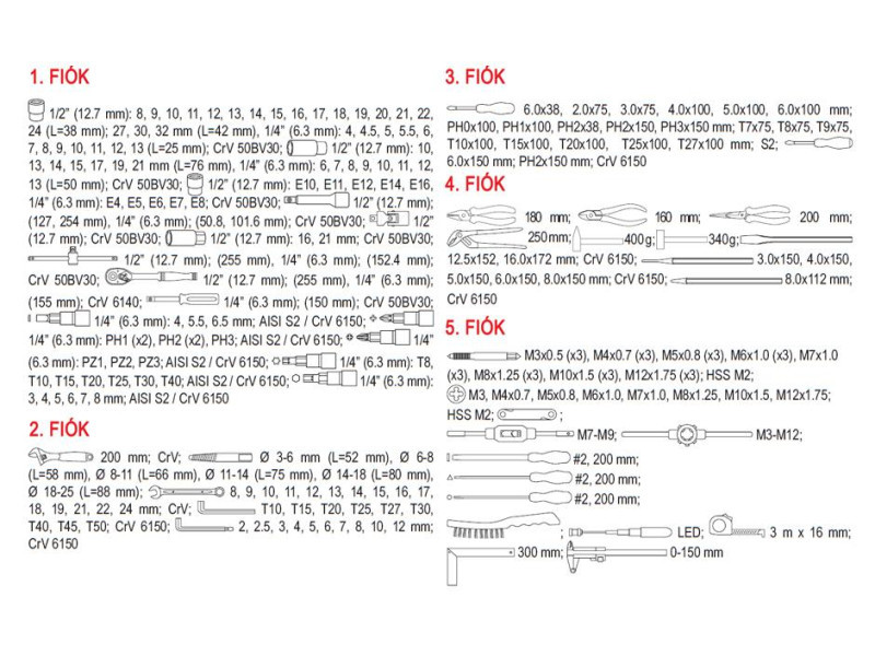 • 211 darabos teljes körűen összeválogatott szerszámkészlet az 5 felső fiókban