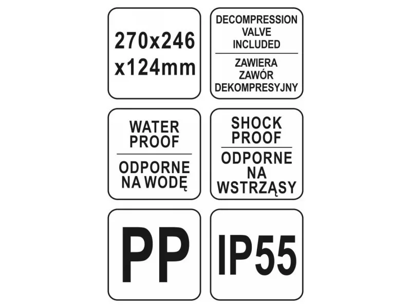 • Külső méretek: 270 x 246 x 124 mm