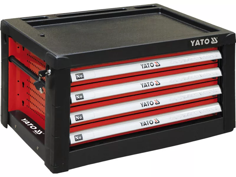 Professzionális műhelyszekrény 4 középen zárható fiókkal felszerelve. Nagy teherbírású, többgolyós mechanikán alapuló golyóscsapágyas csúszdákkal rendelkeznek. A munkapadszekrény ABS anyagból készült műanyag munkafelülettel rendelkezik. A szekrény élei ütésálló anyaggal vannak védve. A porszórt bevonatú szekrény a legmagasabb szintű kivitelezéssel rendelkezik. A munkapadszekrény teljes méretei: 690 mm x 465 mm x 400 mm. A fiókok belső méretei: 533 mm x 397 mm x 55 mm.