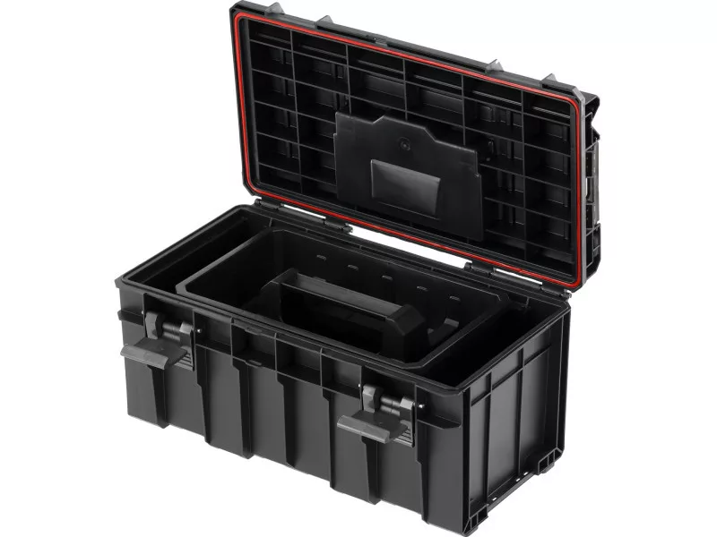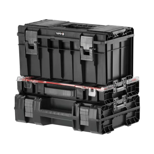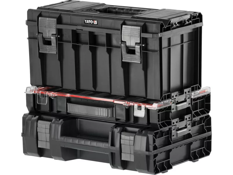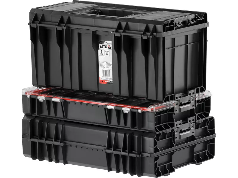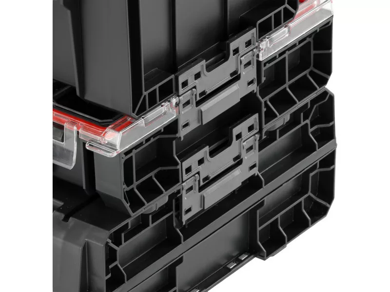 Erős poliamidból készült, robusztus rögzítőelemekkel és oldalsó csatlakozókkal ellátott 3 elemű készlet. A kombináció ebben a konfigurációban érdekes megoldást hoz létre, hogy a műhelyfelszerelés mindig kéznél legyen. A fedelekbe szerelt rugalmas tömítések biztosítják a fröccsenésmentességet, megvédve a tartalmat a fröccsenéstől és a portól.