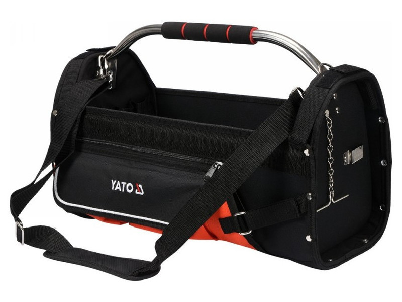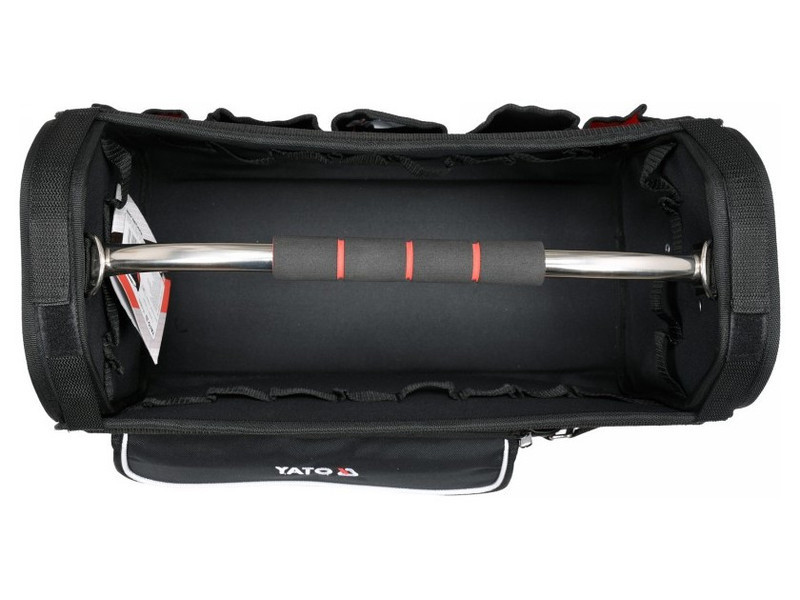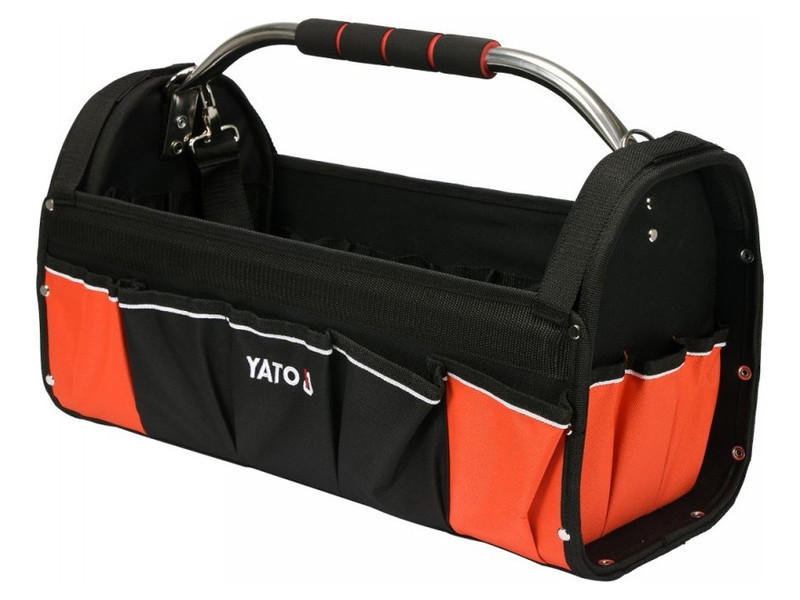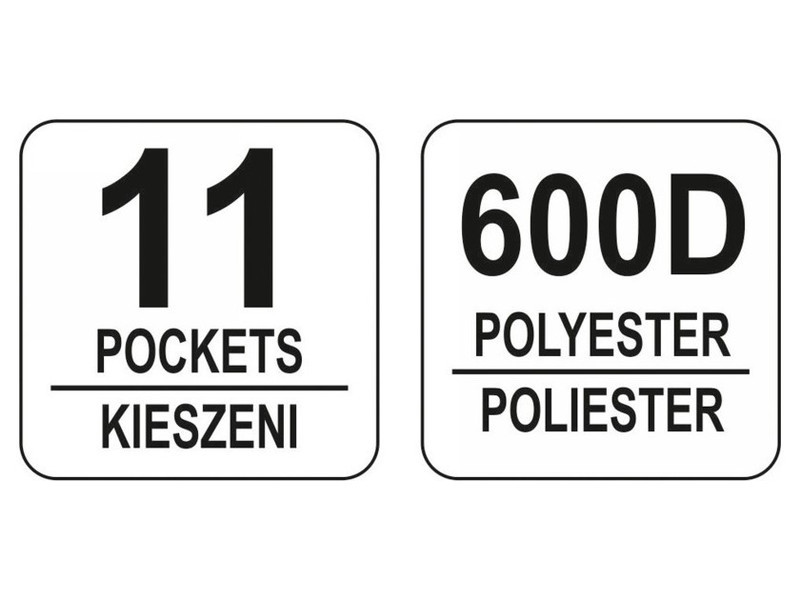 Nagyméretű, nyitott tetejű szerszámosláda technikai 600D poliészterből, megerősített, nedvességálló szerkezettel Fő varratok és zsebek strapabíró kivitelben Központi acélcsöves fogantyú puha csúszásmentes fogantyúval, amely ellenáll a nagy igénybevételnek és stabilizálja a láda alakját. 11 különböző méretű és felhasználási területű zsebbel felszerelve A tároló nyitott profilja gyors hozzáférést biztosít a tárolt szerszámokhoz Elektromos szerszámok, kéziszerszámok és tartozékok közvetlen a munkapadhoz történő szállítására tervezve Elektromos szerszámok, kéziszerszámok és tartozékok közvetlen a munkapadhoz történő szállítására tervezve