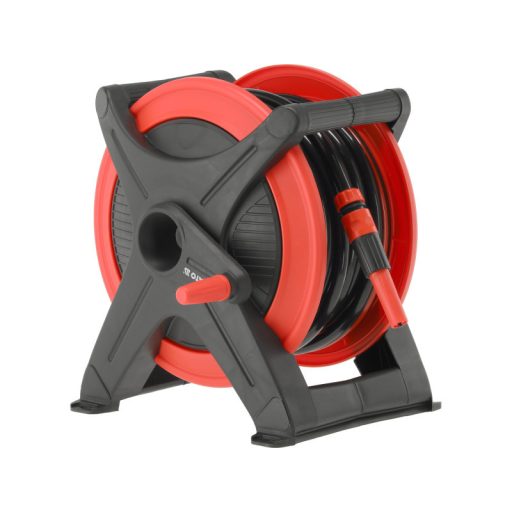 Kényelmes használatú kerti tömlőtartó 30 méteres hosszúságú tömlővel és csatlakozókészlettel. A könnyű, hordozható szerkezet szabadságot biztosít a növények öntözésekor a kertben vagy a telken, valamint a takarítási munkáknál, például az autó vagy a bicikli mosásakor.