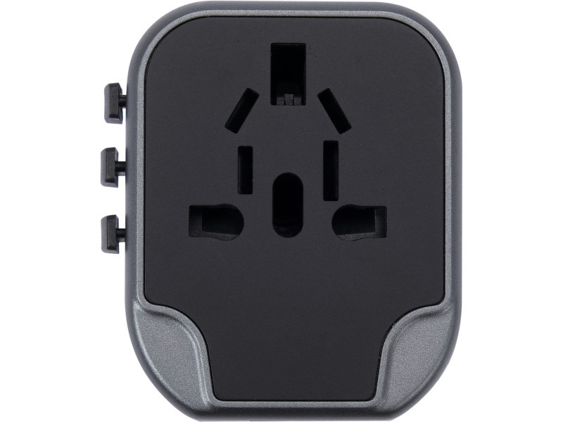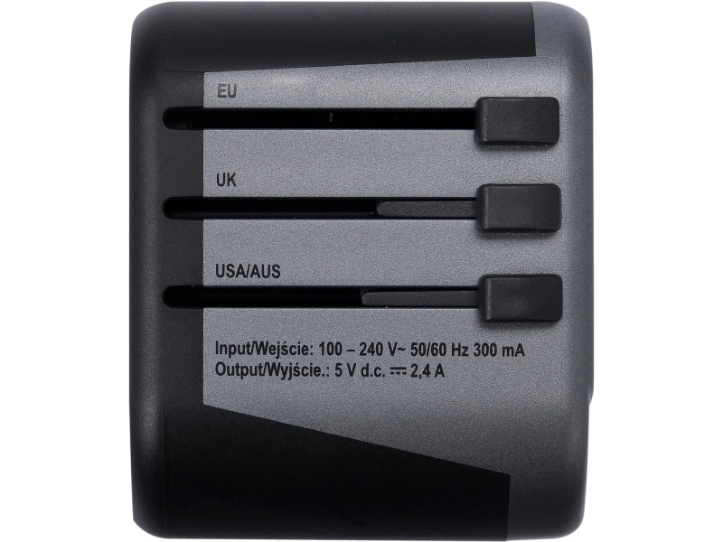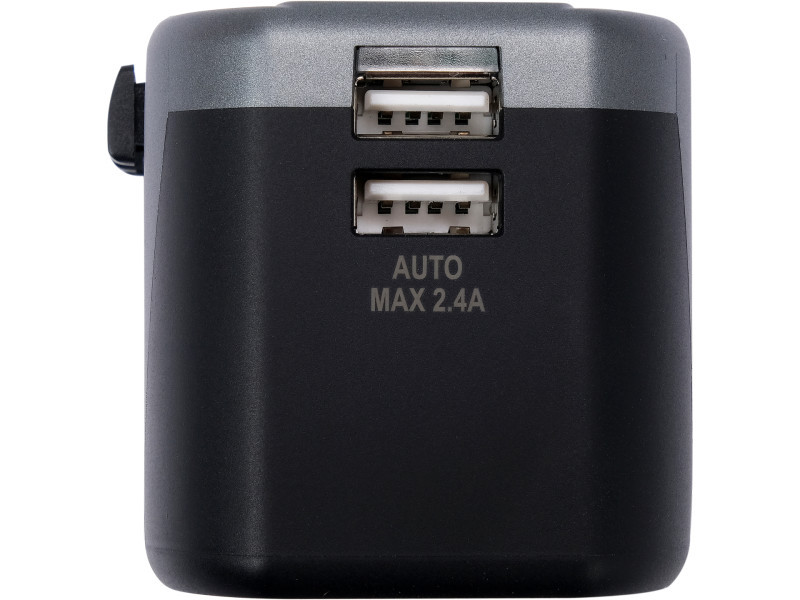 Több mint 150 országba alkalmas utazási adapter beépített töltővel, két USB-porttal. A 12 W-os teljes teljesítményű tápegység kiváltja a telefonok és a legtöbb táblagép töltőit.