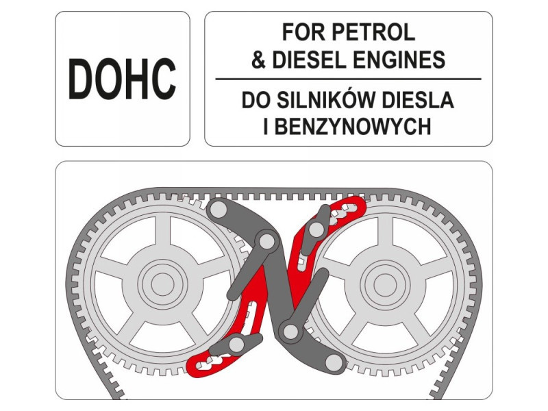 Professzionális reteszelőeszköz, amelyet a dízel- és benzinmotorok dupla felső vezérműtengelyű (DOHC) vezérműtengelyeinek blokkolására terveztek. Autóipari szakszervizek számára ajánlott.