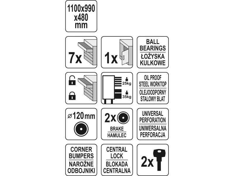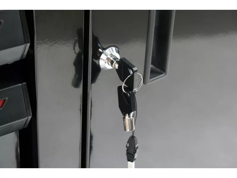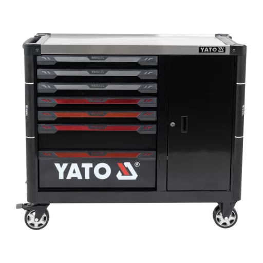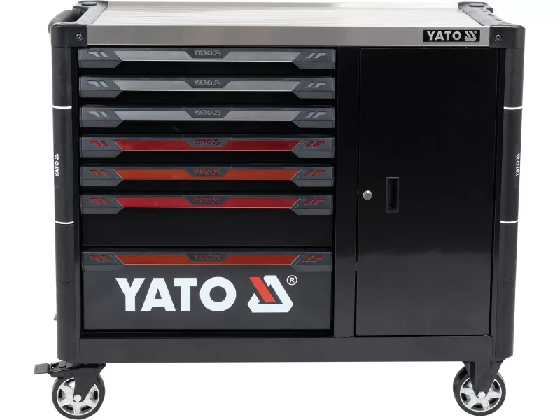 Az új YT-09033 szervizszekrény egyedi kialakítású, olyan mechanizmussal, amely elzárja az egynél több fiók egyidejű kinyitásának lehetőségét. A csapágyazott speciális vezetőknek köszönhetően minden fiók zökkenőmentesen működik. Az egész egységet egy központi zárral zárják.