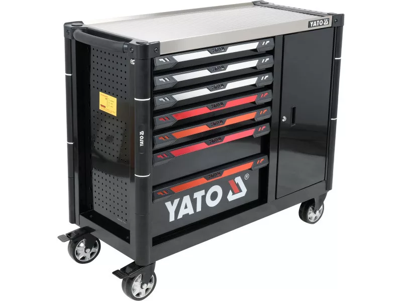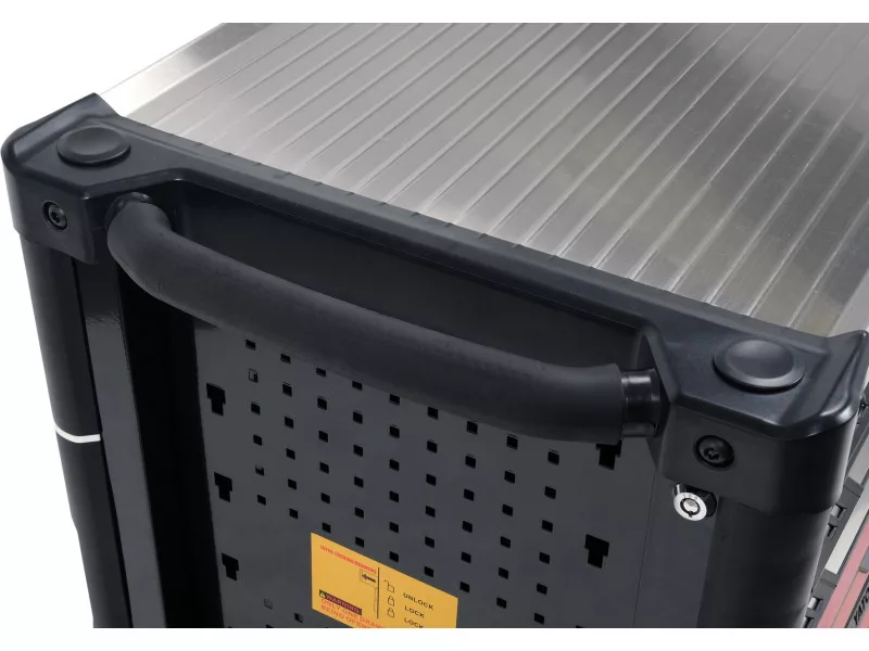 A fiókok mellett egy további tárolórekesz található a nagyobb szerszámok számára. A szekrény stabil fém munkafelülettel és egy kényelmes fogantyúval is rendelkezik a szekrény mozgatásához.