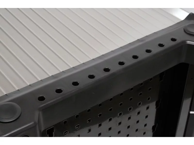 Az oldallapokon univerzális perforáció található a további helykihasználás érdekében. A sarkokon rugalmas ütközők vannak a sérülések megelőzésére.