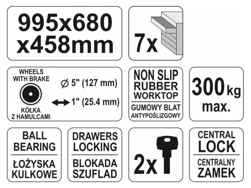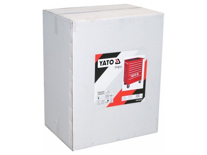 YATO márkájú szervizszekrény. 7 fiókkal rendelkezik golyóscsapágyas csúszdákon, habszivaccsal bélelve. Tartós acéllemezből készült profilok. Teteje olajálló gumival bélelt. A szekrény nagyméretű gumikerekekkel rendelkezik, köztük két forgó kerékkel, biztonsági berendezéssel. Akár 300 kg-os nagy terhelésnek is ellenáll. Nélkülözhetetlen garázsokban és járműszervizekben.
