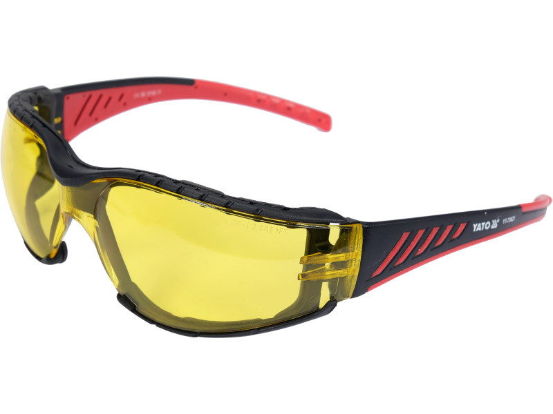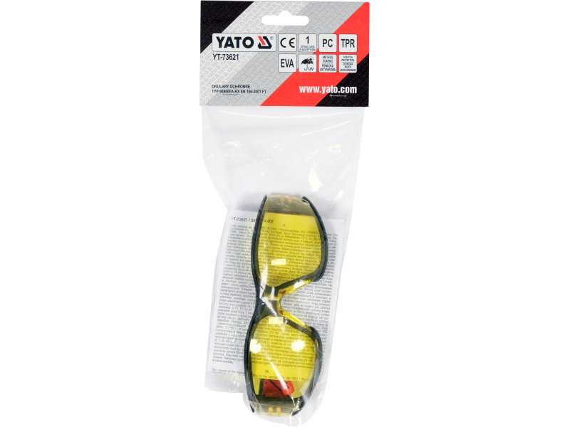 YT-73621 védőszemüveg sárga lencsékkel, kényelmes keretben. A sárga színezés kiszűri a kék fény széles spektrumát, ami a látott tárgyak kontrasztjának növelését eredményezi. Ez lehetővé teszi, hogy jobban tudjon koncentrálni a precíziós munka elvégzésére, nem csak a szabadban. A lencséket párásodás- és karcolásgátló* bevonattal kezelték. Az előbbi megakadályozza a szemüveg bepárásodását, míg az utóbbi véd a túlzott karcolódástól. A legmagasabb optikai osztályba tartozó lencsék nem torzítják a képet, és a káros UV-sugárzás ellen is védenek. A kereteket utólagosan kivehető EVA habszivacs kerettel látták el, amely csökkenti a kemény elemek érintkezését a szem körül. A mindössze 31 gramm súlyú, puha, rugalmas és csúszásmentes halántékvégeknek köszönhetően a szemüveget szinte lehetetlen a fejen érezni.
