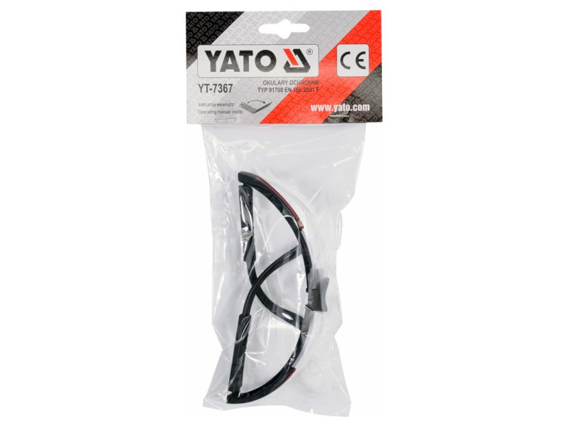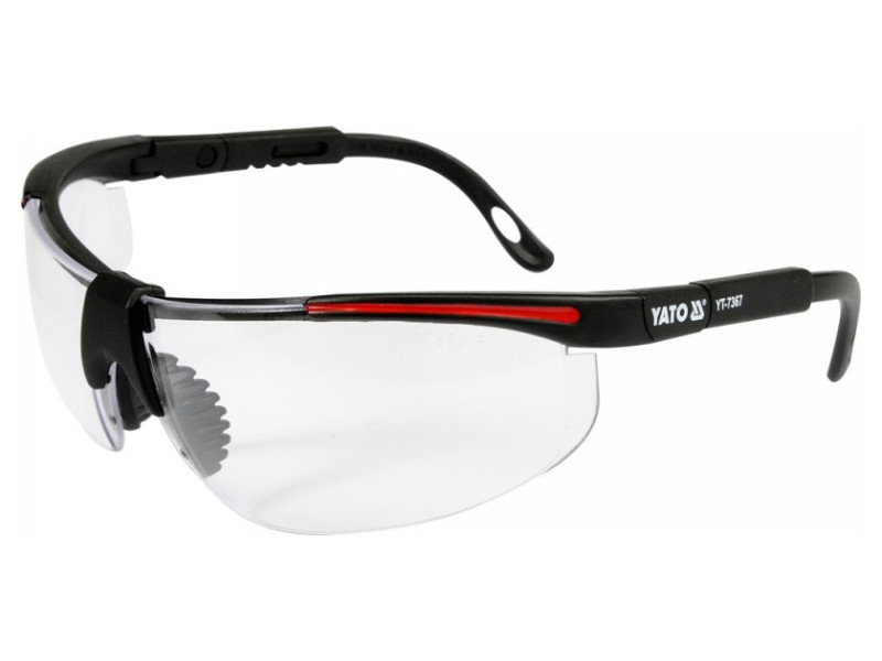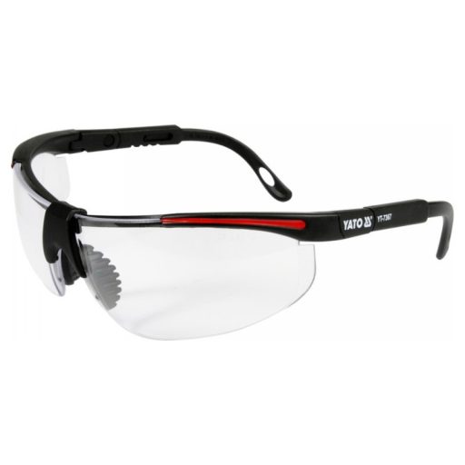 Modern kialakítású YT-7367 védőszemüveg, amely a szem védelmére szolgál kézi és mechanikai munkák, pl. csiszolás, fúrás, vésés stb. során.