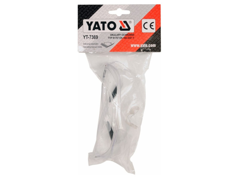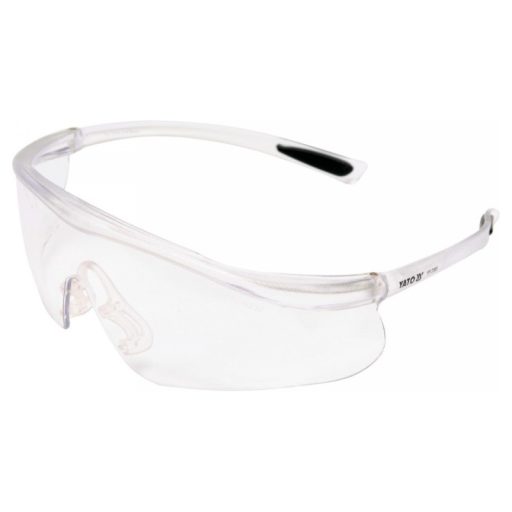 Modern kialakítású YT-7369 védőszemüveg, amely a szem védelmére szolgál kézi és mechanikai munkák, pl. csiszolás, fúrás, vésés stb. során.