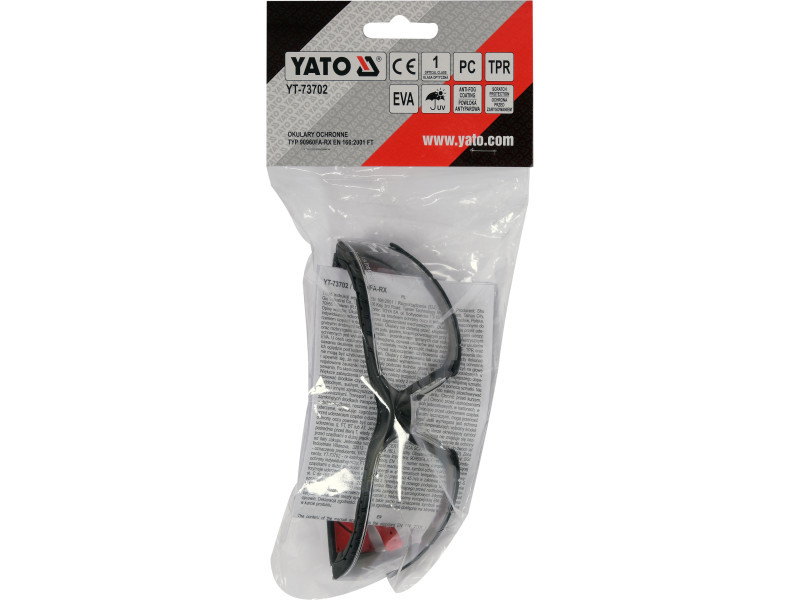 YT-73702 védőszemüveg átlátszó lencsékkel, kényelmes keretben. A lencséket párásodás- és karcolásgátló* bevonattal látták el. Az előbbi megakadályozza a szemüveg bepárásodását, míg az utóbbi véd a túlzott karcolódástól. A legmagasabb optikai osztályba tartozó lencsék nem torzítják a képet, és a káros UV-sugárzás ellen is védenek. A kereteket utólagosan kivehető EVA habszivacs kerettel látták el, amely csökkenti a kemény elemek érintkezését a szem körül. A mindössze 31 gramm súlyú, puha, rugalmas és csúszásmentes halántékvégeknek köszönhetően a szemüveget szinte lehetetlen a fejen érezni.