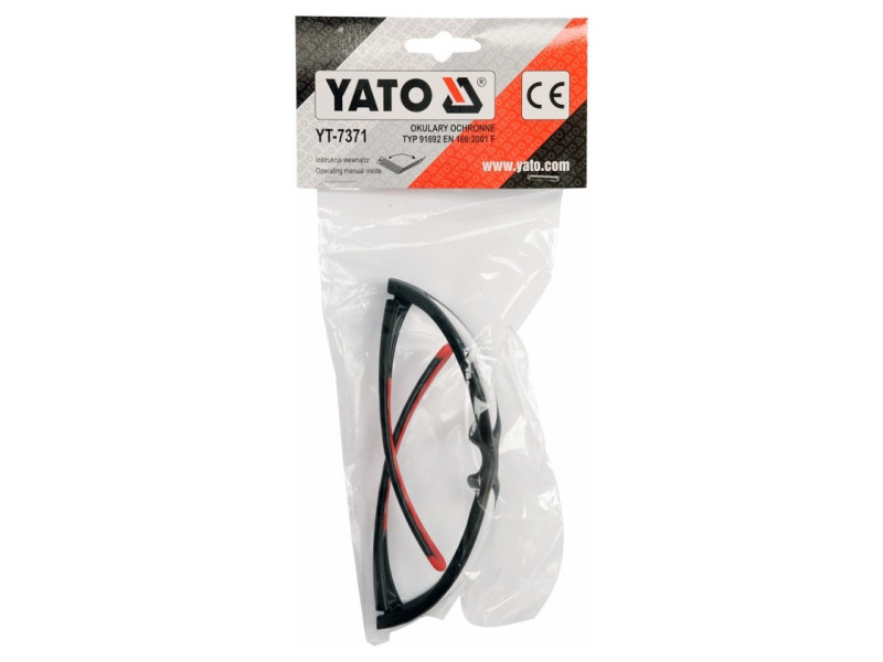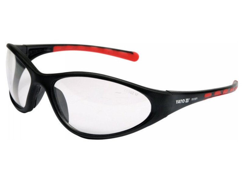 YT-7371 védőszemüveg, amelynek kialakítása a korrekciós szemüvegre hasonlít, és amely a szem védelmére szolgál kézi és mechanikai munkák, pl. csiszolás, fúrás, vésés stb. során.