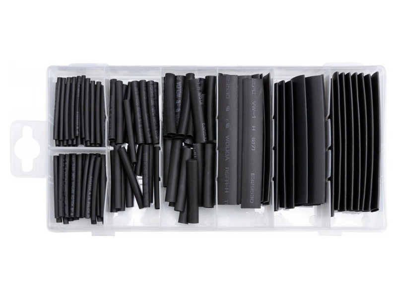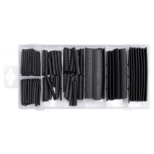 Hőzsugorcső készlet. A csomag tartalma 127 darab zsugorcsövet tartalmaz különböző átmérőkben és hosszúságokban. Fekete színű. Mindegyik egy praktikus "válogató dobozba" csomagolva.